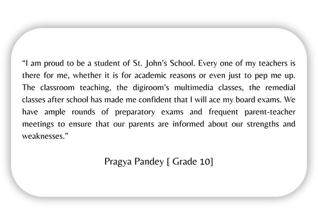 Education at St. John’s extends beyond academics to nurture creativity, values, and life skills. Yoga, Vedic mathematics, abacus, dance, music, art, and SUPW are woven into the curriculum to encourage self-expression and skill development. Assembly talks, the Value of the Day initiative, and a positive discipline policy ensure that every child grows with character, balance, and confidence.